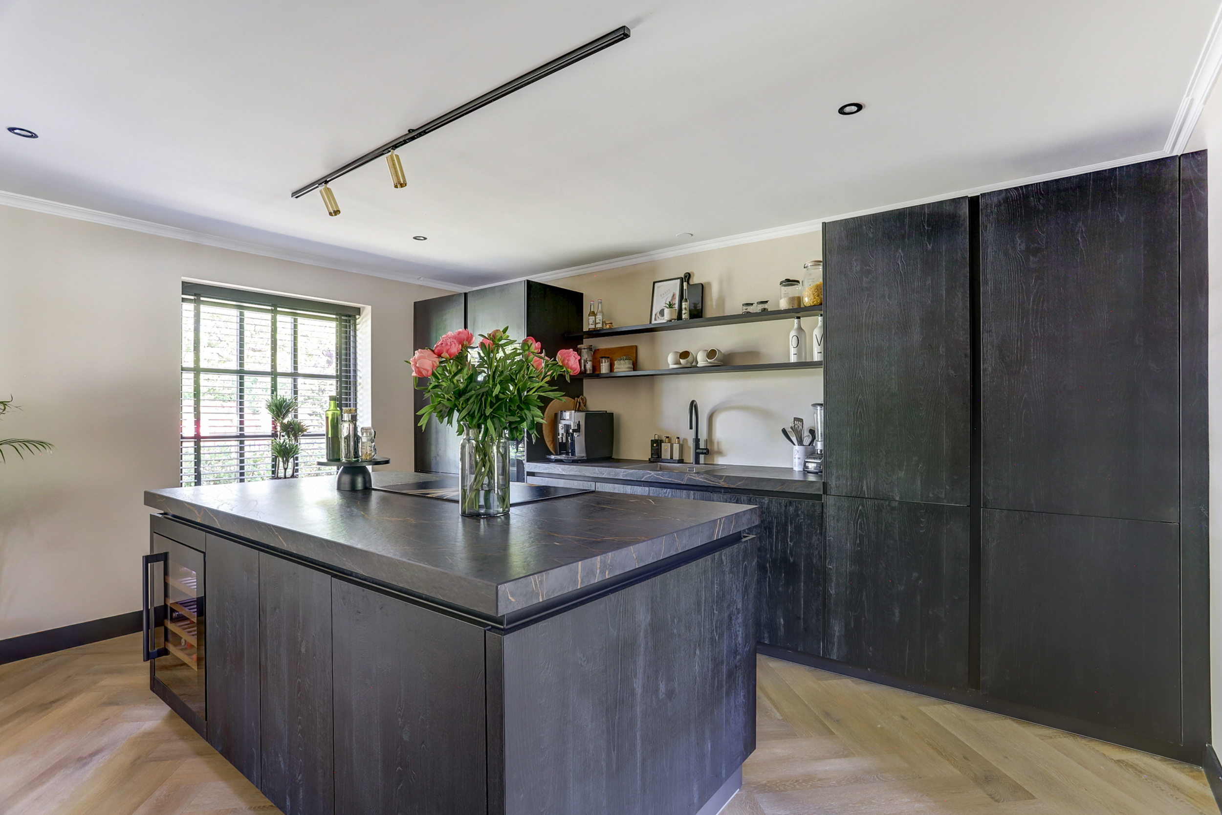 De keuken is in 2022 volledig vernieuwd en het resultaat mag er zijn: een luxueuze, greeploze opstelling in zwart hout met een kookeiland als kloppend hart. De donkere keramieken werkbladen zijn niet alleen een lust voor het oog, maar ook praktisch in gebruik. Ingebouwde wijnklimaatkast? Natuurlijk. Hoogwaardige inbouwapparatuur? Aanwezig. Open wandplanken en subtiele verlichting maken het geheel compleet. Deze keuken ademt design, zonder in te leveren op gebruiksgemak. Koken, borrelen, keuvelen – alles gebeurt hier in stijl.