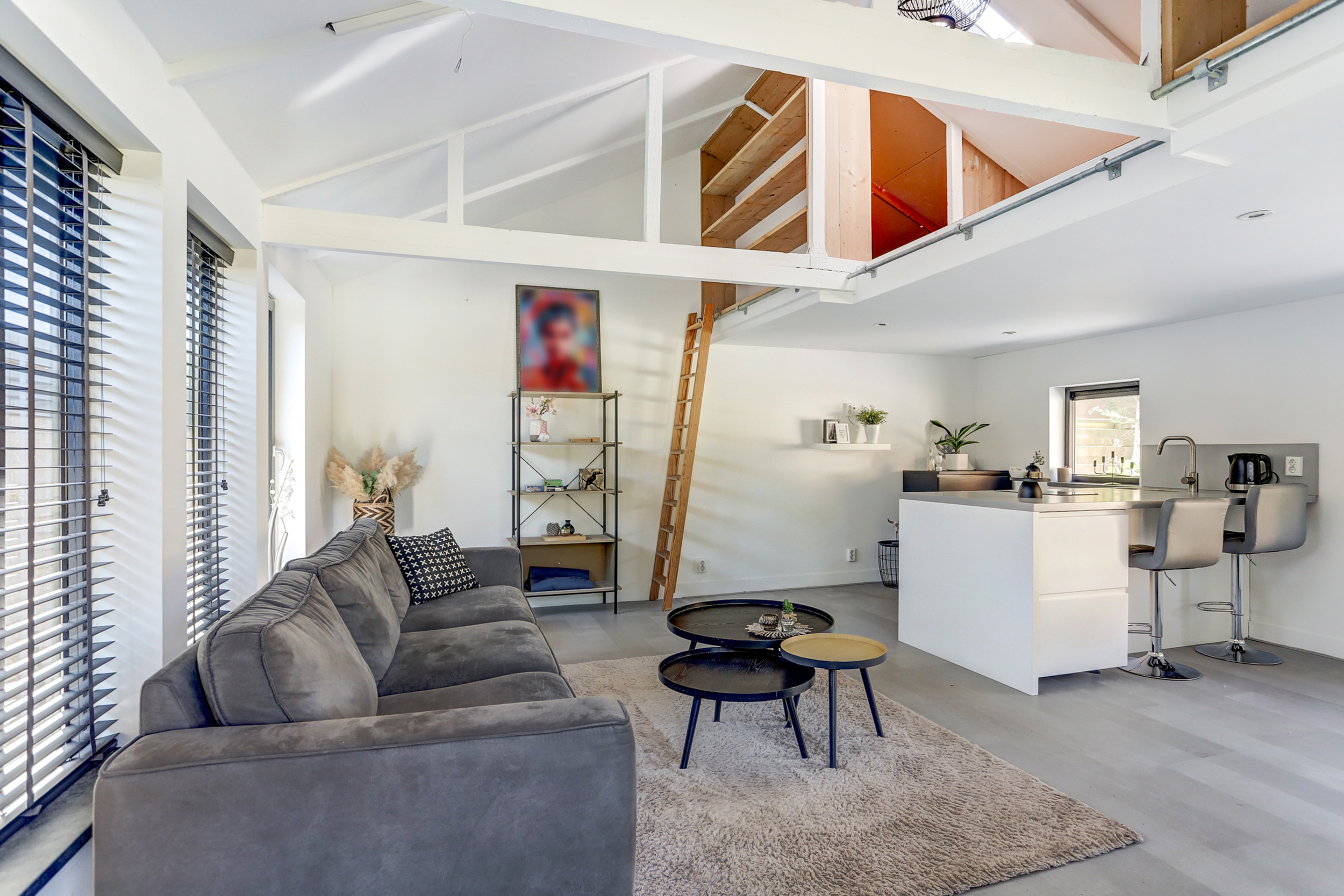 En dan is er ook nog de verdieping: bereikbaar via een speelse houten ladder waar nu een slaapgedeelte van is gemaakt. Het geheel is net zo doordacht als stijlvol, met een rustige uitstraling en een strak kleurenpalet.