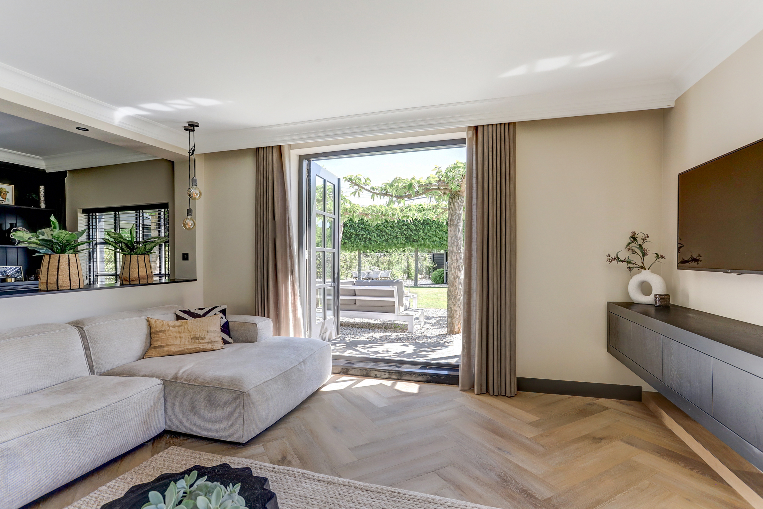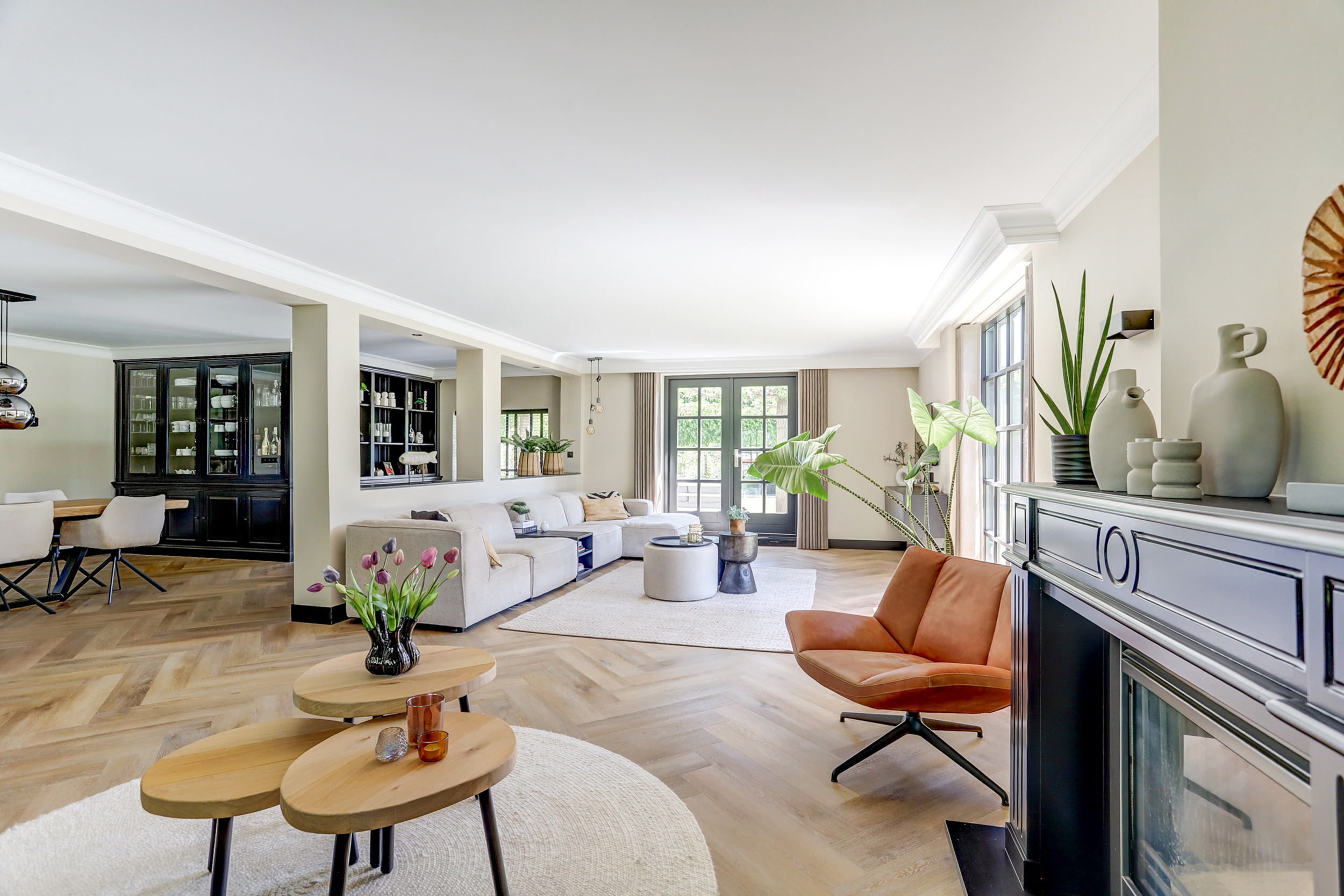 De leefruimte is royaal, licht en perfect in balans. Dankzij de grote raampartijen komt het daglicht rijkelijk binnen en zorgen de zichtlijnen voor een fenomenaal gevoel van ruimte. De woonkamer met sfeervolle (gas)haard is de ultieme plek om te ontspannen. Of u nu neerploft op de bank met een goed boek of gasten ontvangt bij het knisperende vuur – deze ruimte voelt altijd als thuiskomen.